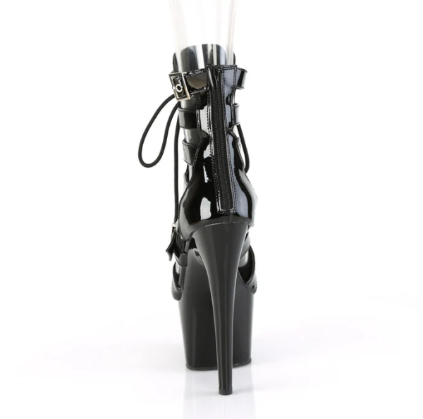 Zwarte lak enkellaarsjes met veters en verstelbare gespriempjes en een ritssluiting aan de achterzijde.