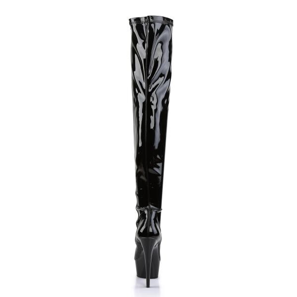 Elegante overknee laarzen met plateau een lange ritssluiting aan de zijkant en een sexy naaldhak. Gemaakt van zwart stretchlak. Hakhoogte 15 cm, plateauhoogte 4.5 cm.