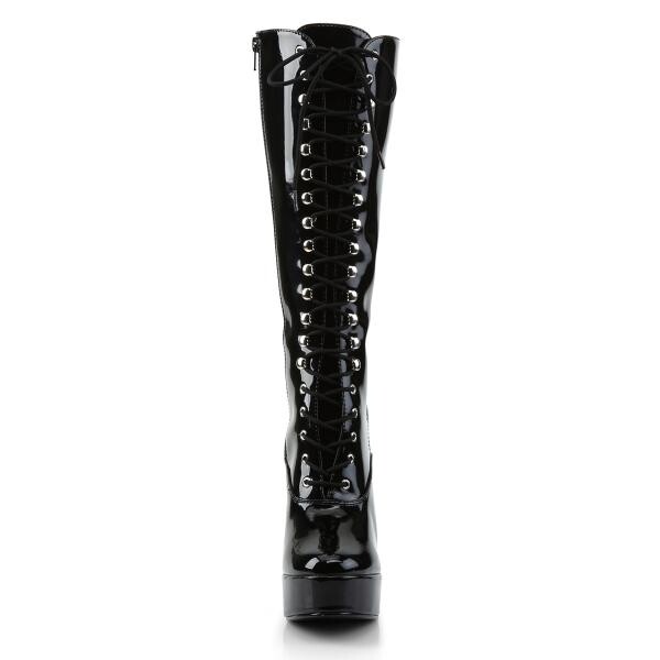 Knie hoge laars gemaakt van hoogglanzende lak. Met ritssluiting aan de binnenkant en een sierlijke vetersluiting voorop. Deze laars heeft een wat rondere neus, een plateauzool en een fijne diablo hak. Door de dikte van deze hak sta en loop je er erg makkelijk op.