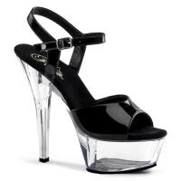 Sexy sandaal met naaldhak. Zwart lak met doorzichtige zool en hak. Hakhoogte 15.2 cm, plateauzool 4.5 cm.