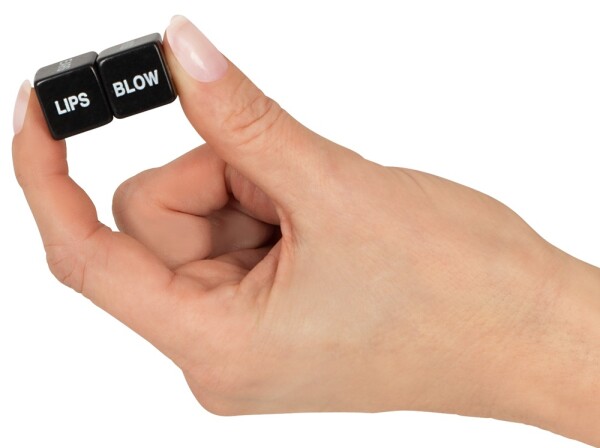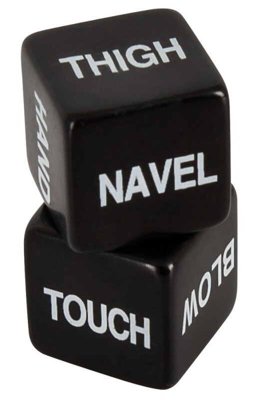 Perfect voorspel! 2 liefdesdobbelstenen in een set in een stijlvolle zwarte look met in het wit gedrukte termen in het Engels. De ene dobbelsteen noemt de uit te voeren actie, de andere dobbelsteen het lichaamsdeel