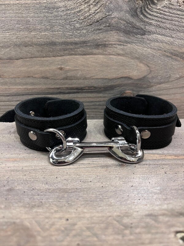 Polsboeien gemaakt van zacht maar stevig zwart leer met een 3-D slangenprint patroon. 3,5 cm breed en voorzien van een stevige metalen D-ring. Een karabijnhaak wordt meegeleverd. Handgemaakt.