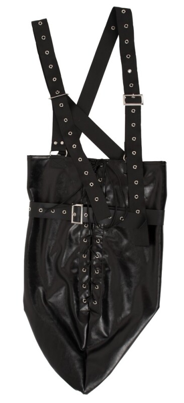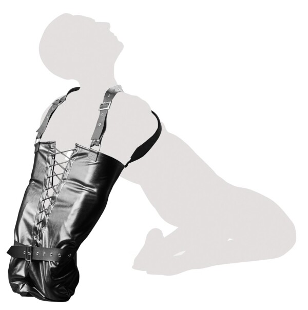 Perfect voor spannende fantasieën! Armzak met vetersluiting en riempjes rond de armen. Inclusief verstelbare schouderbanden, die voor de borst gekruist zijn. Stevig verwerkt in licht glanzend kunstleer.