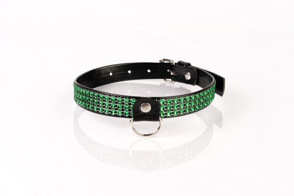 Smalle zwarte vegan collar met gekleurde strass en een D-ring aan de voorkant. Aan de achterkant een metalen gesp.