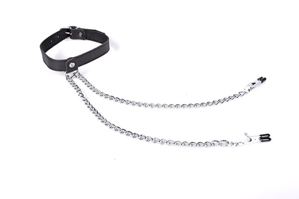 Lederen collar met tepelklemmen aan kettinkjes. De klemmetjes zijn niet verstelbaar en hebben een rubberen tip zodat ze comfortabel dragen.
