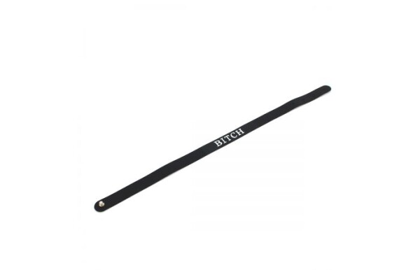 Smalle zwarte siliconen collar met in witte letters BITCH. Deze collar sluit aan de achterkant met een metalen bolletje
