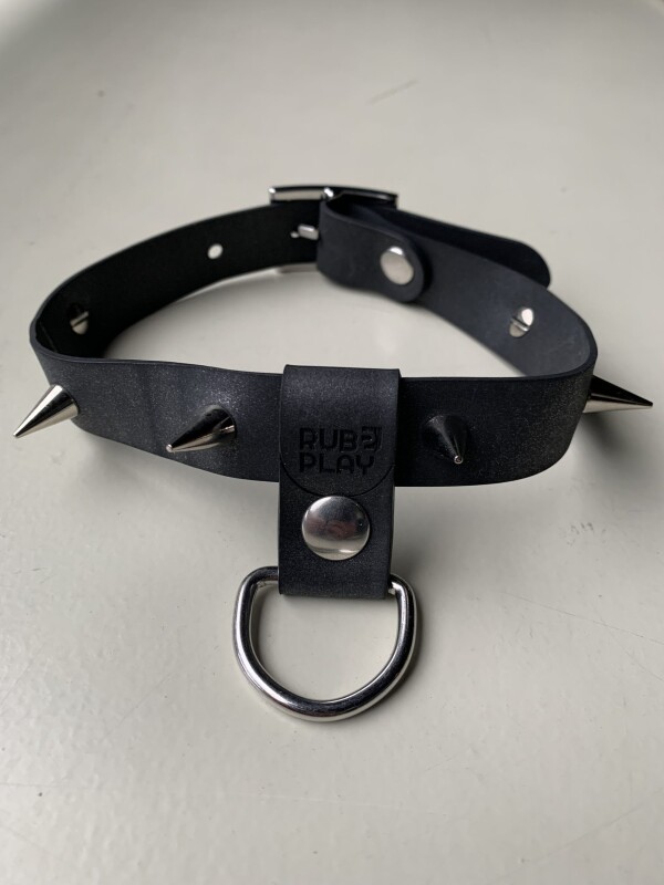 Stoere collar gemaakt van industrieel rubber met metalen spikes. De spikes zijn door het rubber geschroefd, dus zitten goed vast. De band heeft aan de achterzijde een gesp.