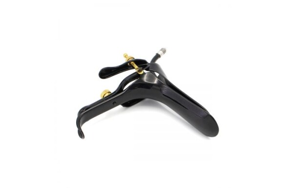 Deze "special edition" groot formaat Black & Gold vaginaal speculum is gemaakt van 100% chirurgisch roestvrij staal en heeft een extra buisje waar je lucht of vloeistof doorheen kunt laten.