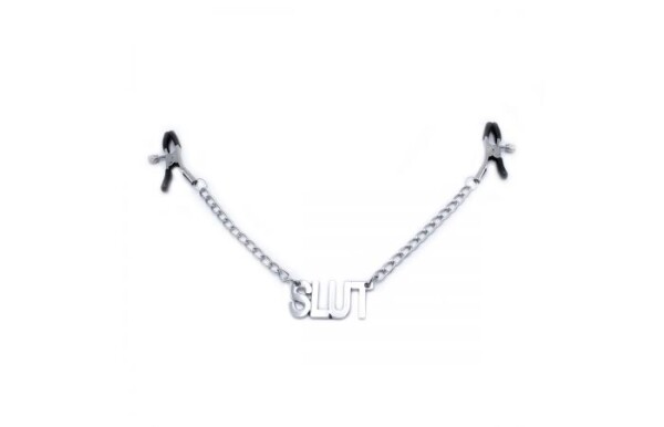 Tag je partner met dit naamlabel dat aan de tepels hangt! Deze tepelklemmen in pincetstijl hebben een kleine ophangketting met de naam: SLUT.