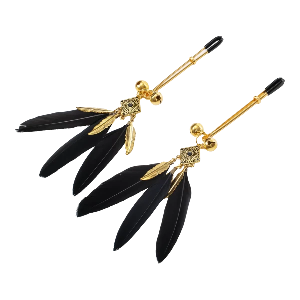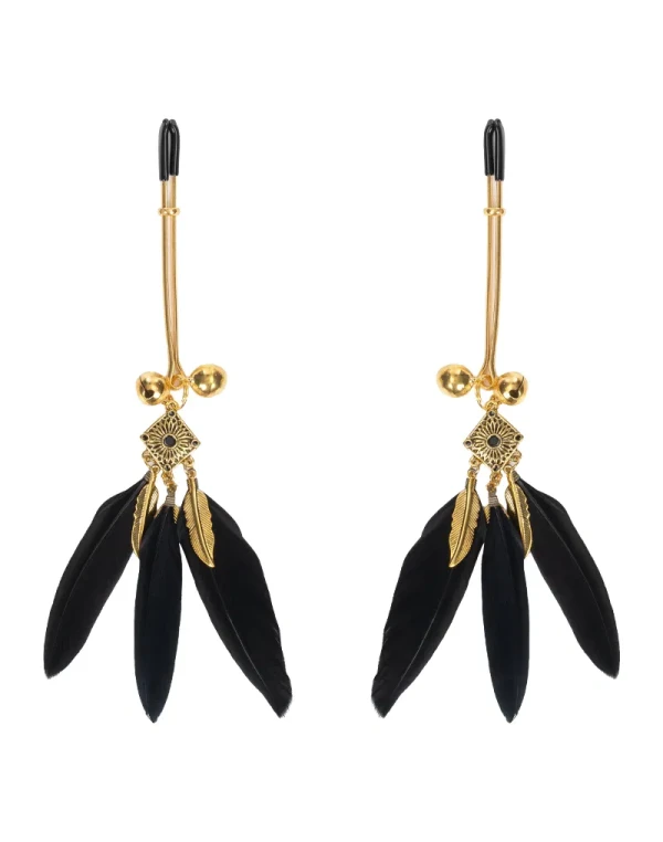 Rimba Bondage Play - Tepelklemmen met veren - Zwart & Goud