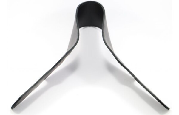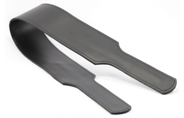 Brede leren paddle met dubbel slagstuk. Gemaakt van stevig echt leer. De handgrepen zijn inwendig versterkt, voor een goede grip. Totale lengte 84 cm, dubbel gevouwen 42 cm. Breedte van het slagstuk 7.5 cm. Breedte van de handgreep 4 cm.