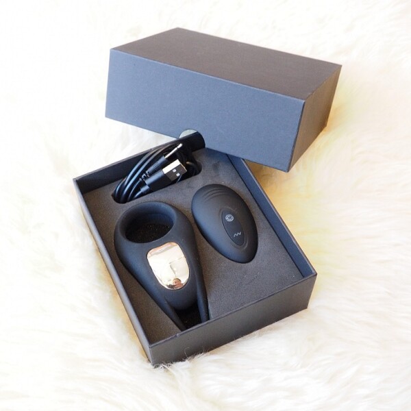 Spannende vibrerende cockring in fluweelzachte zwarte siliconen met goudkleurige accenten.
