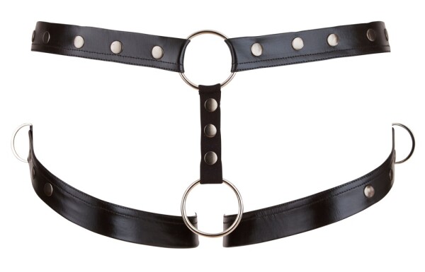 Tailleband in matte look met elastische dijriem. Met D-ringen aan de zijkant en een penisring aan de riem. Maat verstelbaar door drukknopen. De bijgeleverde cockring heeft een diameter van 50 mm en is verwisselbaar voor een eigen cockring.