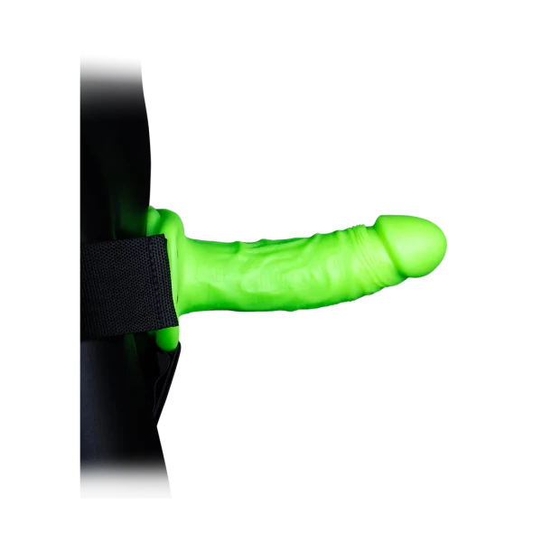 Wees brutaal met deze strap-on! Het strap-on harnas is elastisch en verstelbaar waardoor het op elk lichaam past. Durf anders te zijn met deze holle siliconen dildo. Ouch! Glow-In-The-Dark producten moeten worden geactiveerd met het zonlicht voordat je er in het donker van kunt genieten.