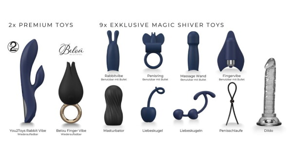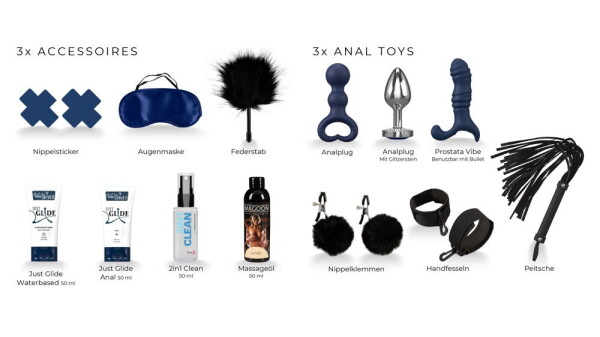 Inbegrepen zijn: 2 x premium speeltjes, 9 x speeltjes, 3 x anaal speeltjes, 3 x accessoires, 4 x vloeistoffen, 3 x zachte bondage.