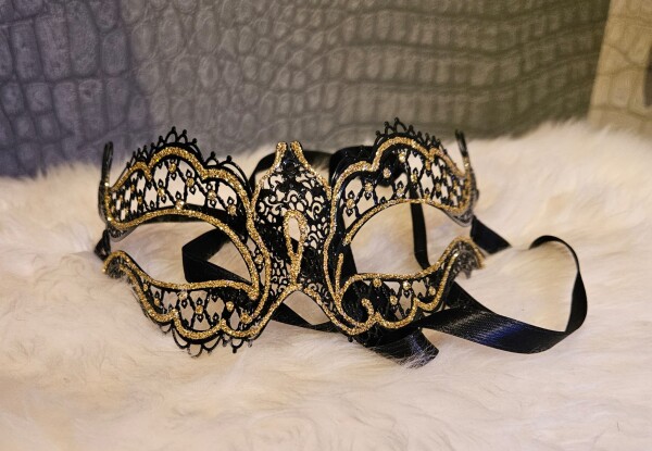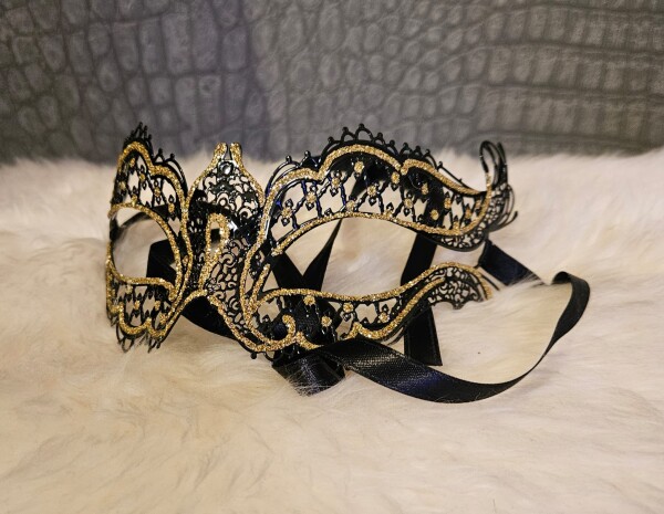 Handgemaakt metalen masker met mooi kanten design, in zwart met goud. Achter het hoofd een lint om te strikken. Enigszins buigzaam voor een perfecte pasvorm.