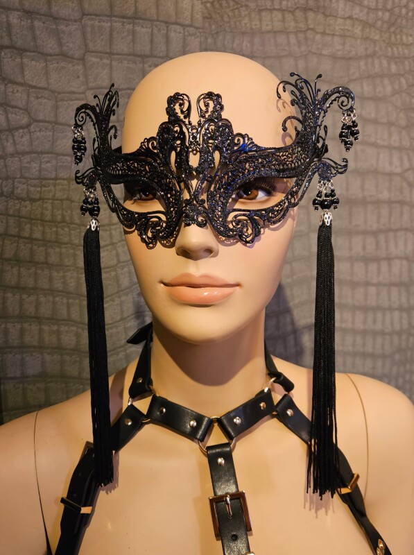 Handgemaakt metalen masker met mooi kanten design, in zwart. Dit masker heeft aan beide zijden leuke juweel-ornamentjes en prachtige franjes.