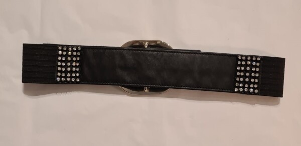Leren riem met elastische tussenstukken en strass versiering aan de voor- en achterkant.