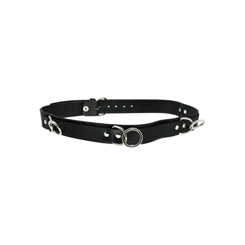 Leren bondageriem met 4 stevige metalen D-ringen waaraan een O-ring bevestigd is. Met de sluiting dmv een gesp op de rug. Er zijn 2 ringen aan de voorkant bevestigd en 2 aan de zijkanten. Alle ruimte dus om er touwen of kettingen aan vast te maken. Breedte riem : 3.5 cm Minimale omtrek : 77 cm. Maximale omtrek : 96 cm