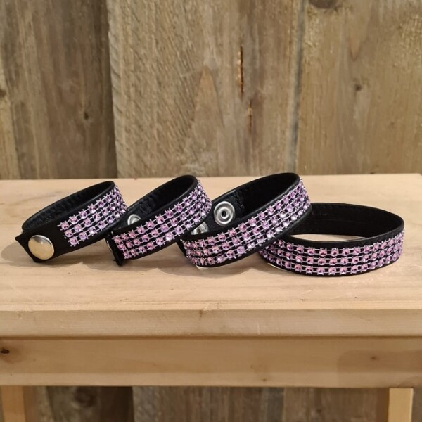 Zwarte leren armbandje met rondom roze strass. Sluit met 2 drukkers. Polsomtrek S: max 18 cm. M : max 20.5 cm. L : max 23 cm. XL : 25.5 cm