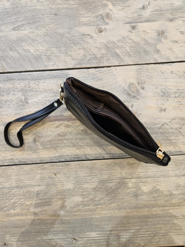 Kunstleren tasje met 4 vakjes, afsluitbaar met ritsen. Deze leuke tas is voorzien van een handige polslus. Afmetingen: 19.5 x 10 cm.