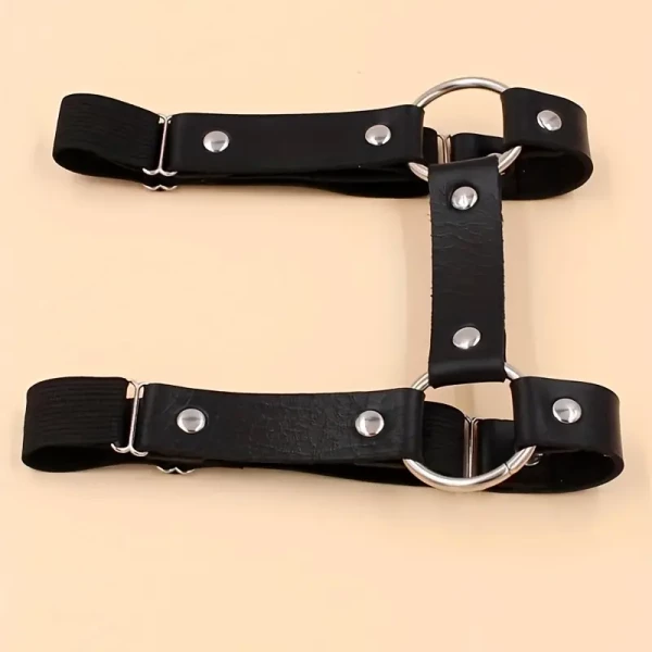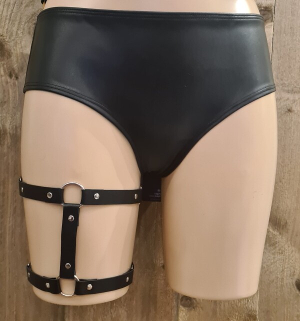 Kunstleren beenharnas. De bandjes zijn aan de achterkant voorzien van een elastische verstelbare band, zodat dit leuke beenharnas altijd als gegoten zit.