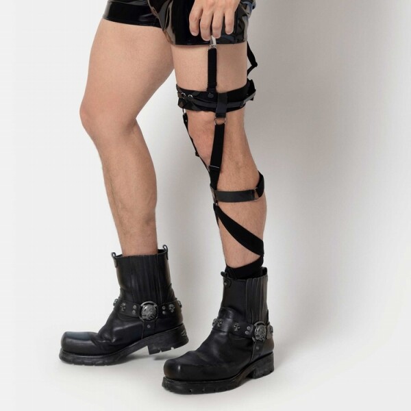 Mooi been harnas gemaakt van elastische banden en een brede band rond het bovenbeen met 2 knijpers om te bevestigen aan je broekje.
