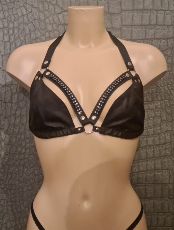Prachtige halter BH gemaakt van soepel leer met strass accenten langs de borsten. De bandjes zijn verstelbaar in de nek en op de rug middels een riempje met metalen gesp.