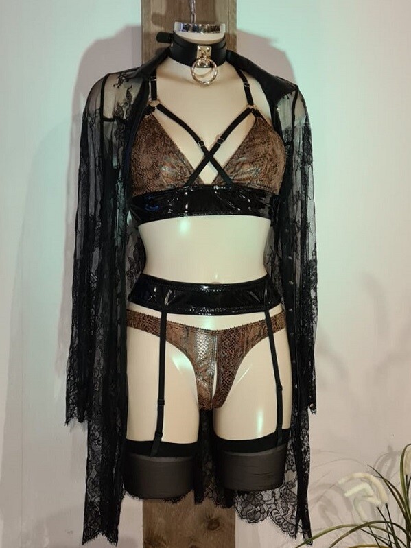 Triangel BH met mooie bruin-gouden slangenprint en zwarte lak details. Alle bandjes zijn verstelbaar en hebben mooie goudkleurige schuivertjes. De sluiting van deze BH zit aan de zijkant.