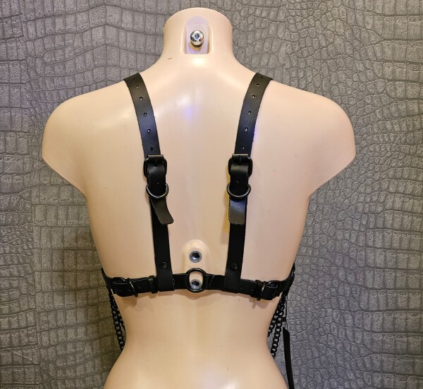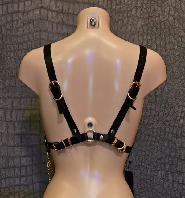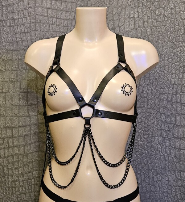 Leren open cup BH met metalen kettingen. De schouderbanden en de tailleband zijn verstelbaar middels metalen gespen. Het leer is van stevige kwaliteit.