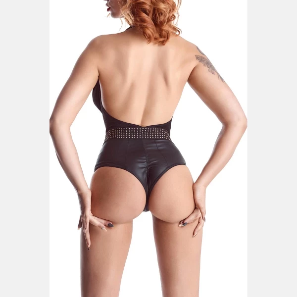 Elastische halterbody met een mooi decolleté. Het onderste gedeelte bestaat uit een hoog getailleerde slip van wetlookmateriaal met een plooi op de billen, het bovenste gedeelte is van soepelvallende tricot. Om het middel een baan met bronskleurige studs.