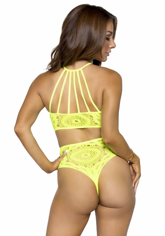 Gehaakte kanten halter crop top met bandjes op de rug en bijpassende string met hoge taille