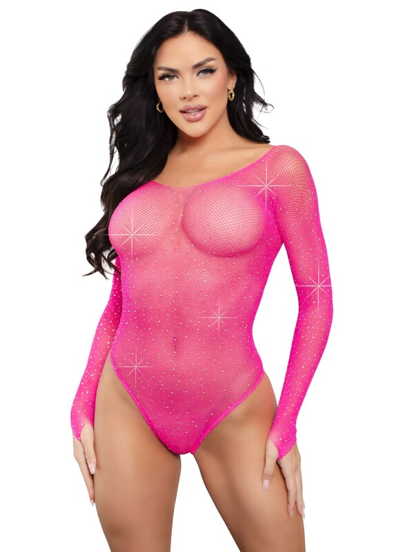 Body met lange mouwen en een wijde ronde hals, gemaakt van elastische netstof die bezaaid is met schitterende strass steentjes. De roze en groene variant geven licht in blacklight!