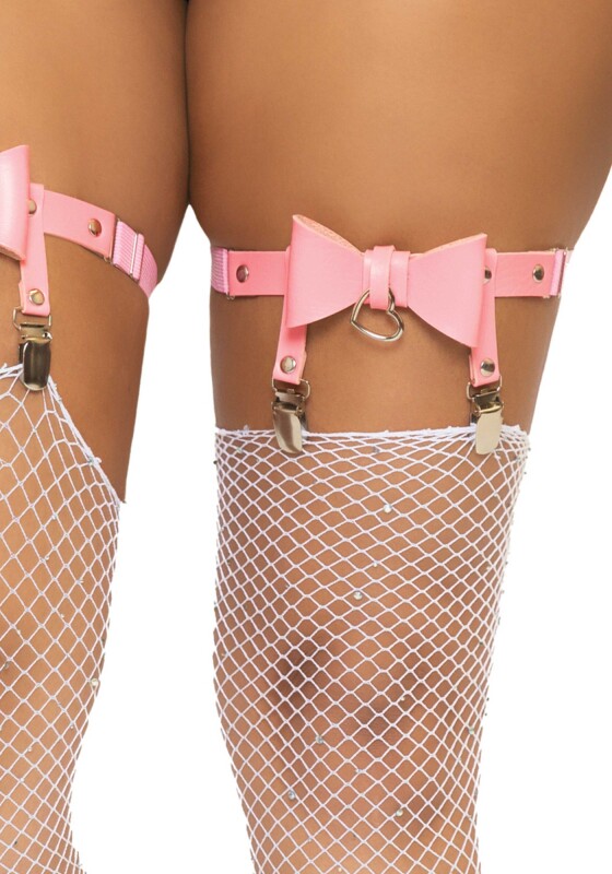 Kunstleren beenbandjes met sexy strikje. Aan ieder bandje zijn 2 stevige knijpers bevestigd om je kousen goed te laten zitten.