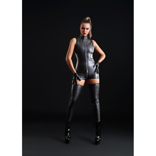 Kunstleren combishort met korte pijpjes en een lange zilverkleurige 3-weg rits.