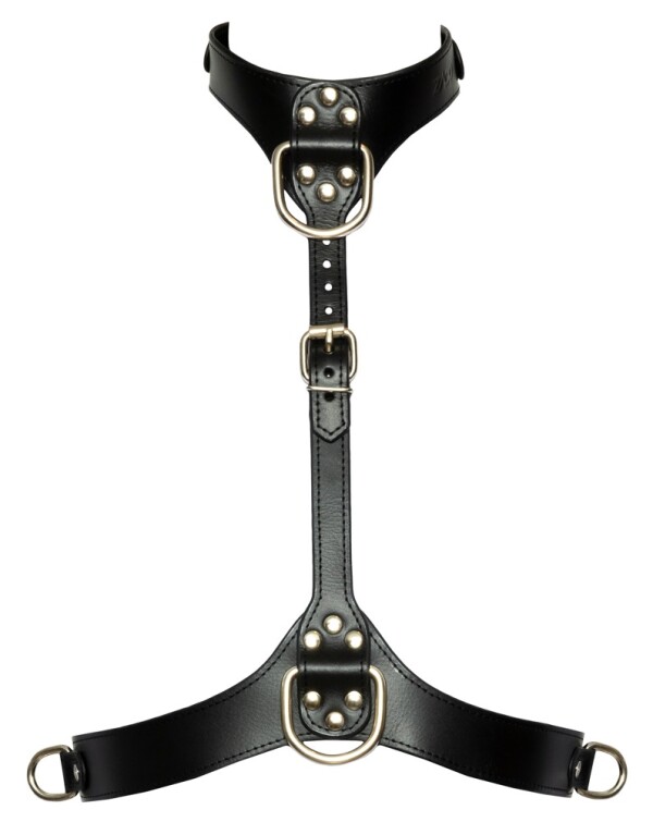 Stoer bondage borst harnas gemaakt van stevig zwart kunstleer. Voorzien van 4 zilverkleurige metalen D-ringen. De bandjes rond de hals en romp zijn aanpasbaar met gespen. Ook het bandje wat de halsband met de andere band verbindt is aanpasbaar in lengte.
