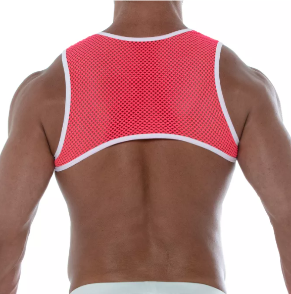 Neon roze borstharnas, gemaakt van elastisch visnet materiaal. Aan de voorzijde 2 metalen ringen.