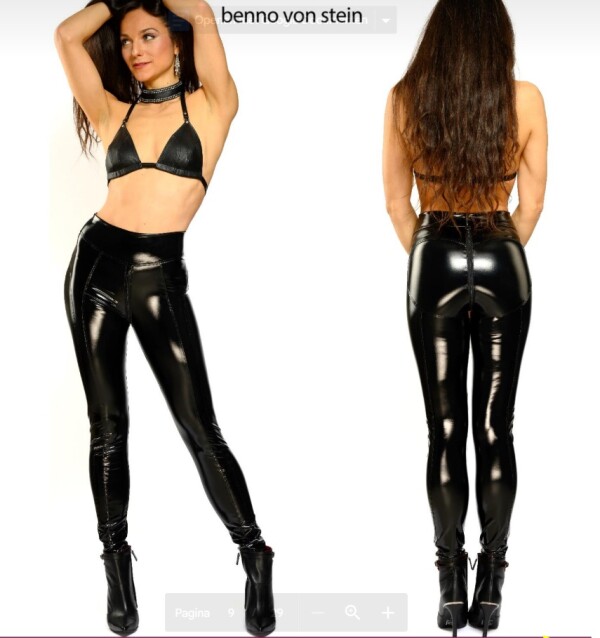 Lange broek met spectaculaire belijning in licht elastische hoogglanzende zwarte lak. Met een zwarte rits van voor tot achter.