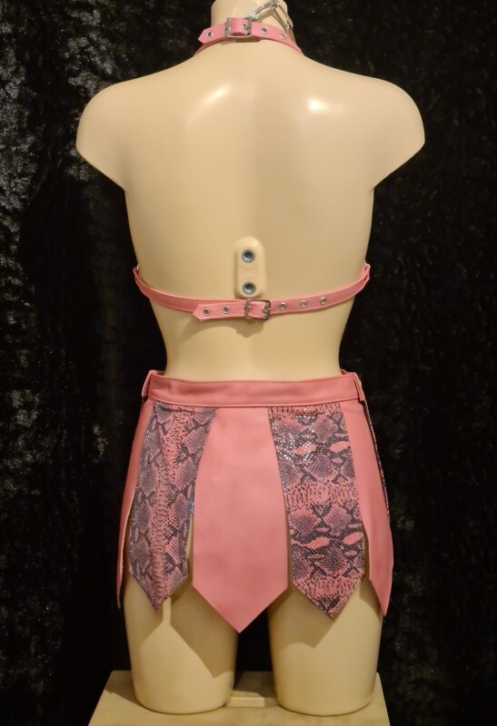 Geweldige set gemaakt van zacht roze leer afgewisseld met snake-print leer in een roze tint. De gladiatorrok heeft afwisselend effen roze en snake-print roze flappen. De top is effen roze met snake-print cups.