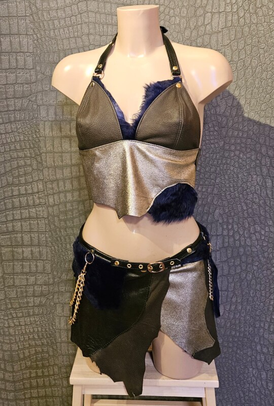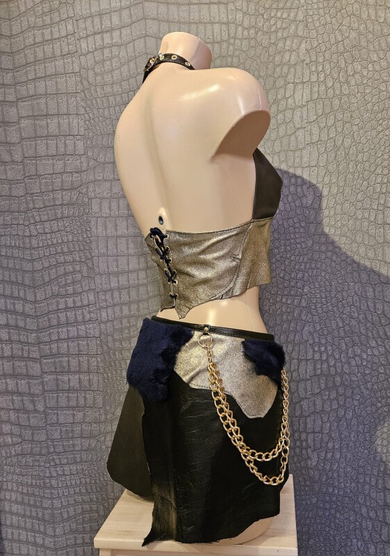 Set Odilia. Prachtige leren set afgewerkt met bont en metalen kettingen. Gemaakt van groen, bruin en goudkleurig leer, het kunstbont is donkerblauw, de kettingen zijn goudkleurig aluminium.