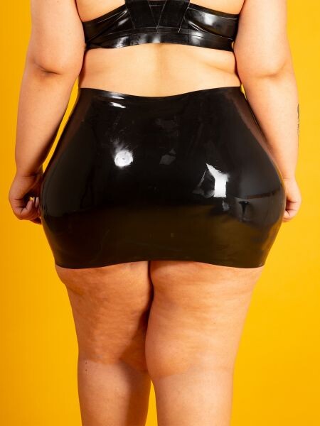 Mooi gesneden latex mini rok met een zilverkleurige metalen rits aan de voorkant.