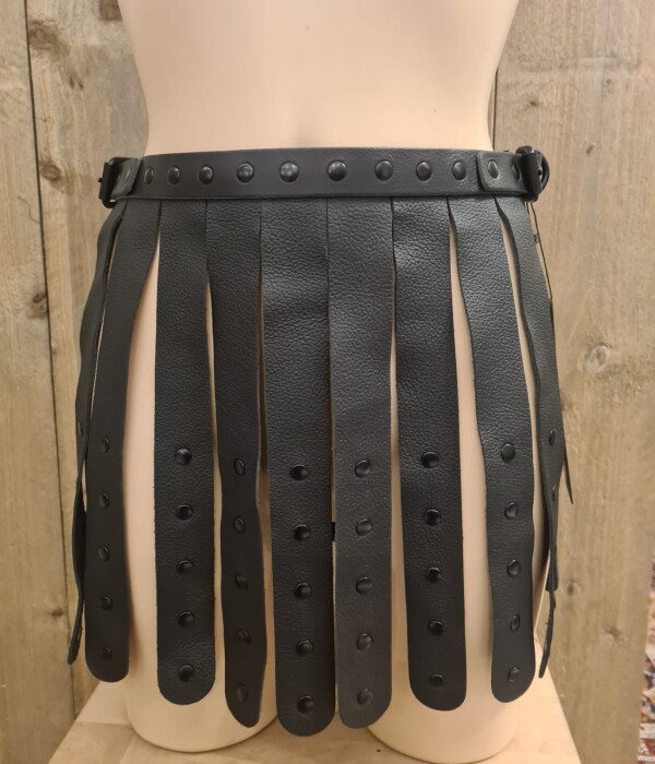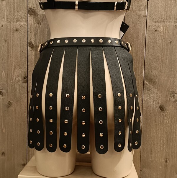 Gladiatorrok Roxy, voor dames. Deze stoere rok is gemaakt van stevig leer rond de taille en soepeler leer voor de flappen van de rok. De tailleband is aan elkaar te bevestigen met gespen aan beide zijdes, waardoor de pasvorm ook altijd goed is. De tailleband en de flappen zijn voorzien van goudkleurige of zwarte studs.
