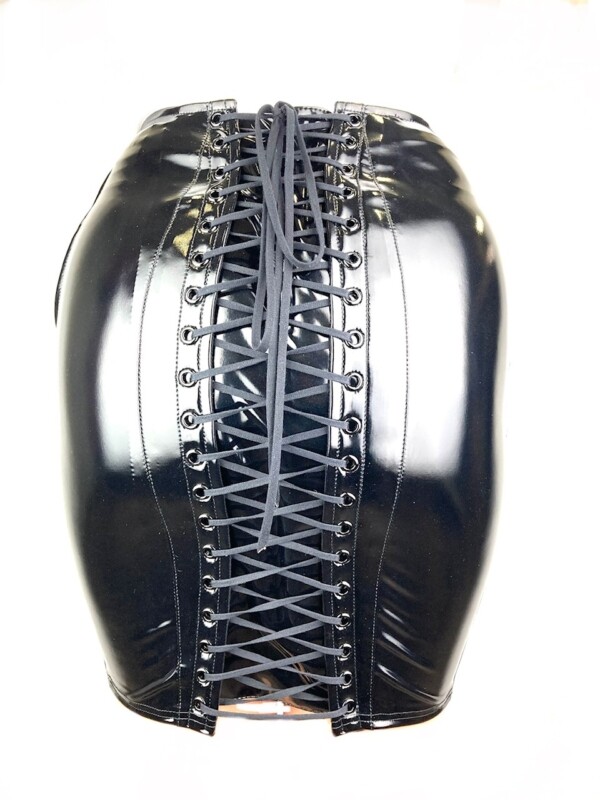 Kokerrok gemaakt van hoogglanzende zwarte lak met een sexy vetersluiting op de billen. Aan de zijkant een fraai weggewerkte korte rits om hret aantrekken te vergemakkelijken en zodat de rok mooi aanluit in de taille.