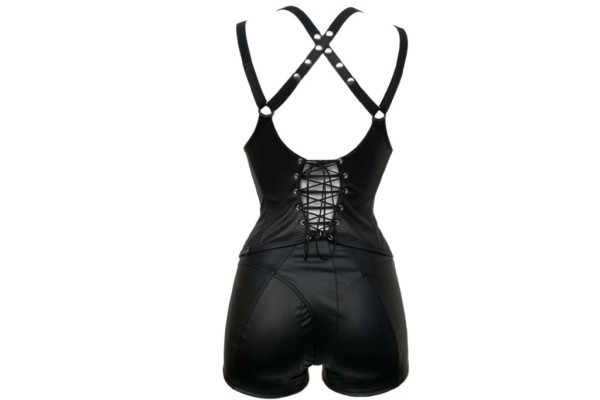 Gladde kunstleren top met rits aan de voorkant en verstelbare gekruiste bandjes achter
