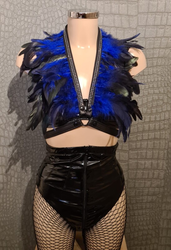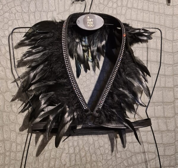 Prachtige veren boa gemaakt van leer met veren een een schtterende rij strass. Je maakt deze boa vast met 2 riempjes rond de taille, zodat het altijd mooi blijft zitten.