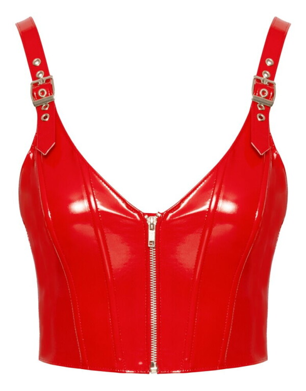 Aansluitende top, geheel in felrood lakleer. Geïntegreerde baleinen voor een perfecte, figuurvolgende pasvorm. Metalen rits over de gehele lengte aan de voorkant. De bandjes zijn verstelbaar met decoratieve gespen.