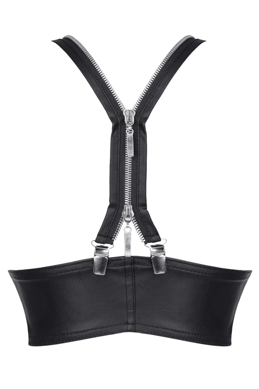 Kunstleren top met zilverkleurige metalen rits en verstelbare bandjes op de rug.