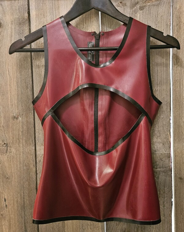 Spannende top gemaakt van bordeaux rood latex afgebiest met zwart. De borsten zijn vrij in deze top, die sluit op de rug met een lange zwarte kunststof rits.