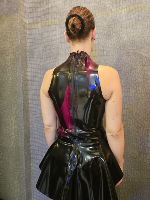 Hooggesloten haltertop met rits. Gemaakt van zwart gemarmerd gekleurd latex.