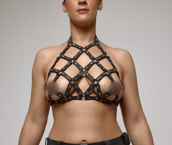 Dit Laura Top harnas, gemaakt van zacht rubber, voelt natuurlijk aan en laat je borsten prachtig uitkomen. Het ruitpatroon van de bandjes past zich aan elke lichaamsvorm aan, waardoor het veelzijdig genoeg is om over kleding of direct op de huid te dragen. Op verzoek kan deze top met extra materiaal worden gemaakt in grotere maten.